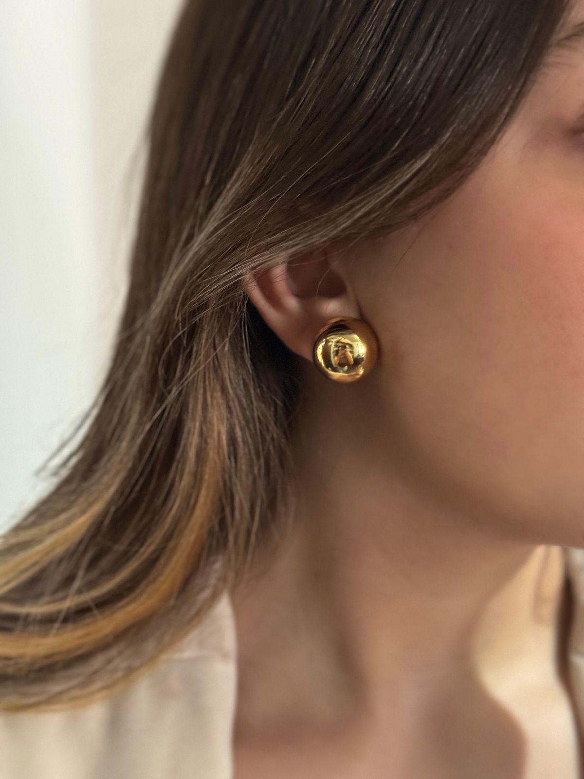 Este brinco é uma peça-chave que combina estilo contemporâneo com um toque de elegância atemporal. O seu formato de bola (ou domo) grande e polido em tom dourado o transforma em um acessório de alto impacto.