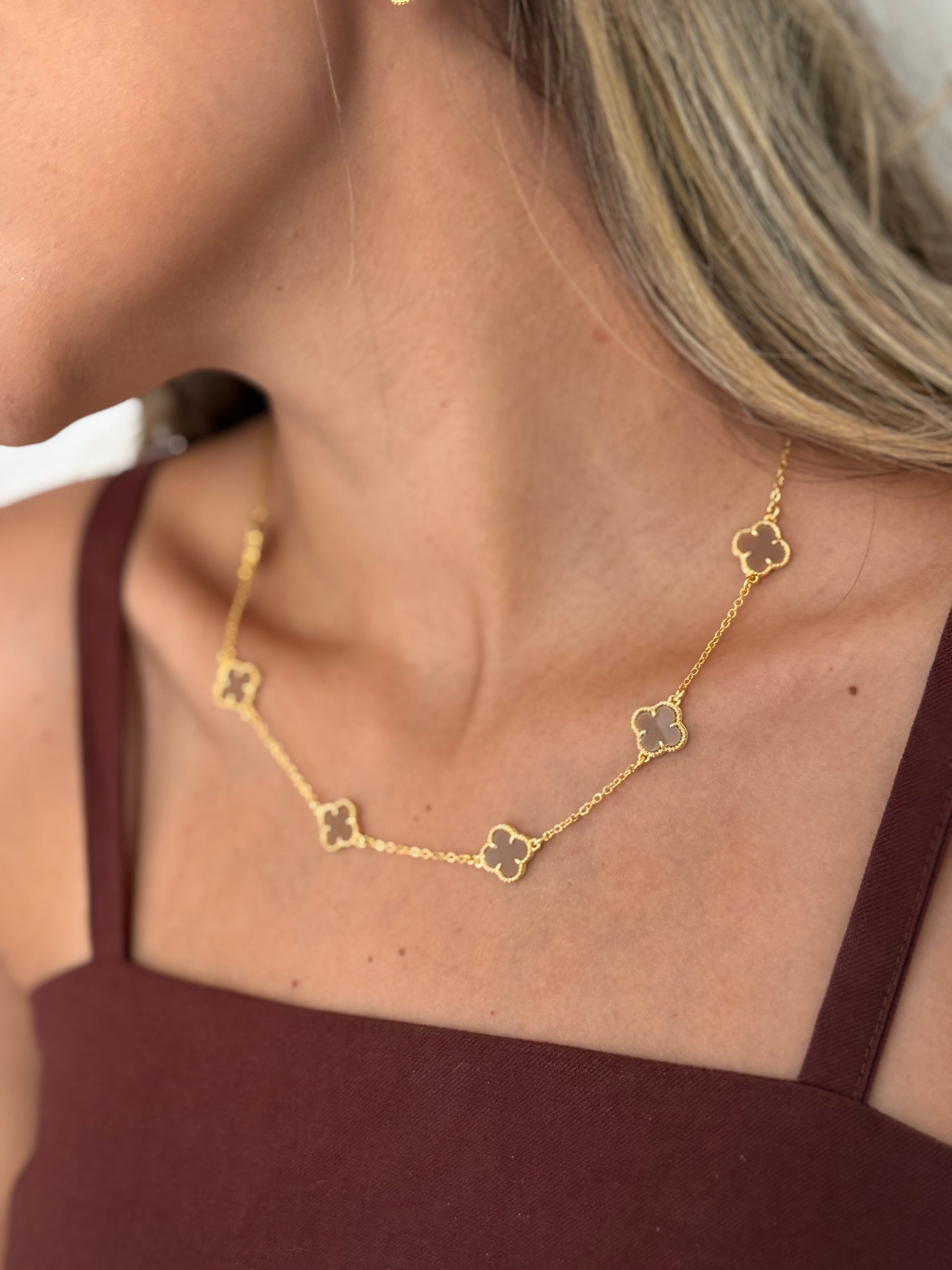 Esse colar é uma peça elegante que apresenta delicados pingentes em forma de trevo, frequentemente associados à sorte e à fortuna. Na tradição, o trevo simboliza fé, esperança e amor, tornando este colar um acessório significativo e encantador.