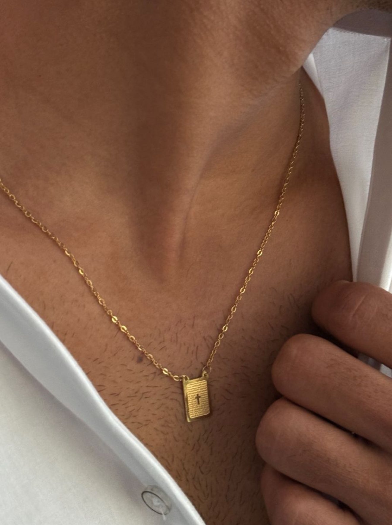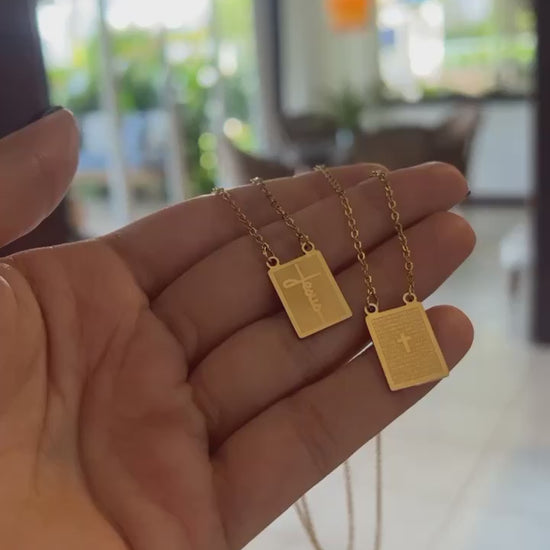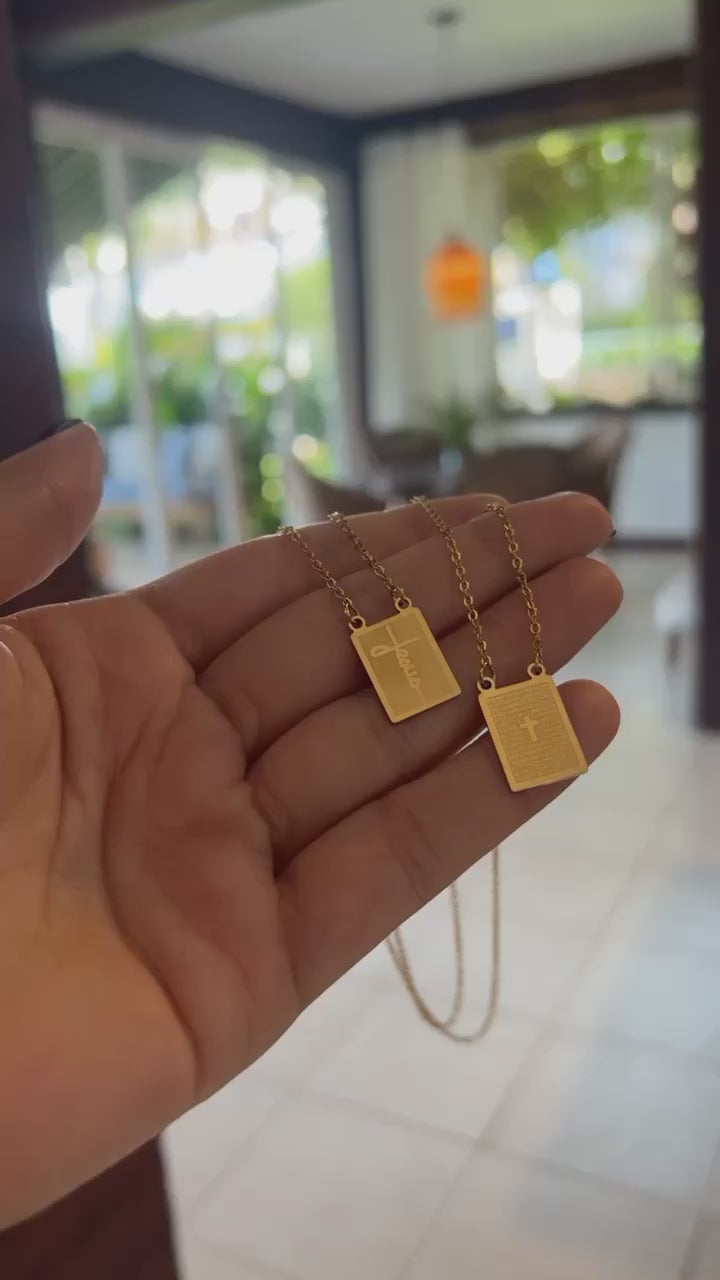 Esse escapulário masculino é confeccionado em aço inoxidável, garantindo durabilidade e resistência. A peça é composta por duas medalhas retangulares conectadas por uma corrente de elos, também em aço inox. Uma das medalhas exibe uma gravação "Jesus" em uma tipografia fluida e elegante, enquanto a outra medalha apresenta o trecho da oração "Pai Nosso" gravado.